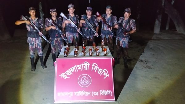 রৌমারীতে জামালপুর ব্যাটালিয়নের (৩৫ বিজিবি) অভিযানে আসামীবিহীন ভারতীয় মদ-১৬ বোতল আটক।